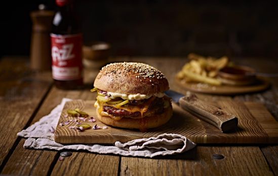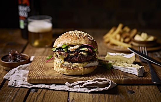 Buns boulangerie Brier, steack façon bouchère 130 gr, brie de Meaux AOP, thym, sauce burger maison, compotée d’oignons rouges déglacée crème balsamique framboise, mesclun