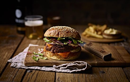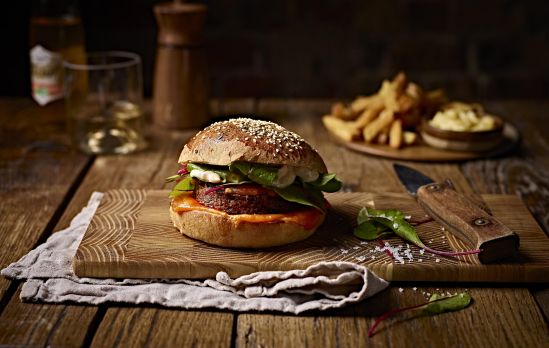Buns boulangerie Brier, steack de légumes confits, oignons rouges, mimolette des Flandres, mesclun, sauce burger maison